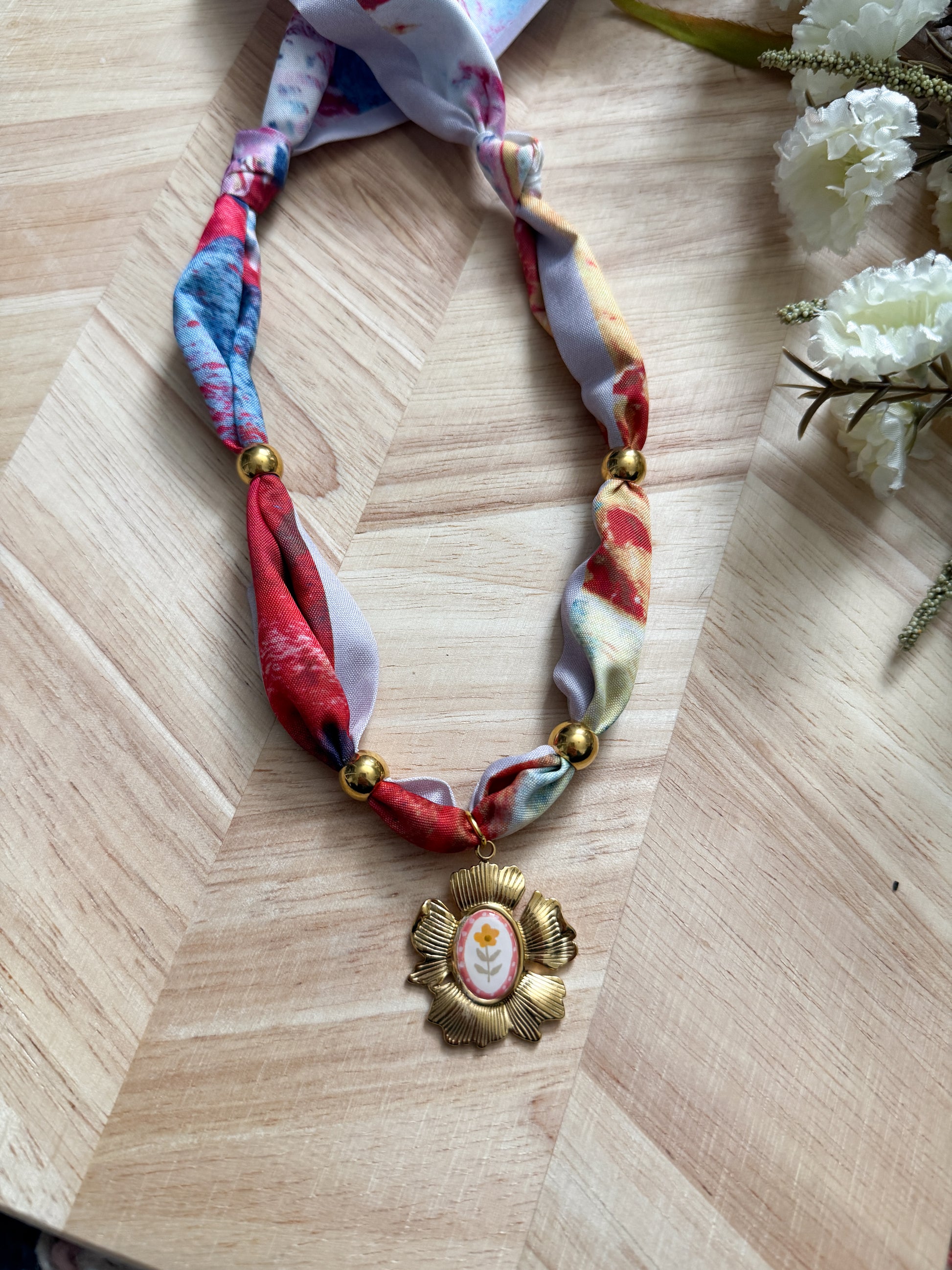 This handmade necklace is one of a kind with a variety of charms including hand-painted clay charms! This silk material necklace is adjustable by being able to tie it at whatever length you prefer.