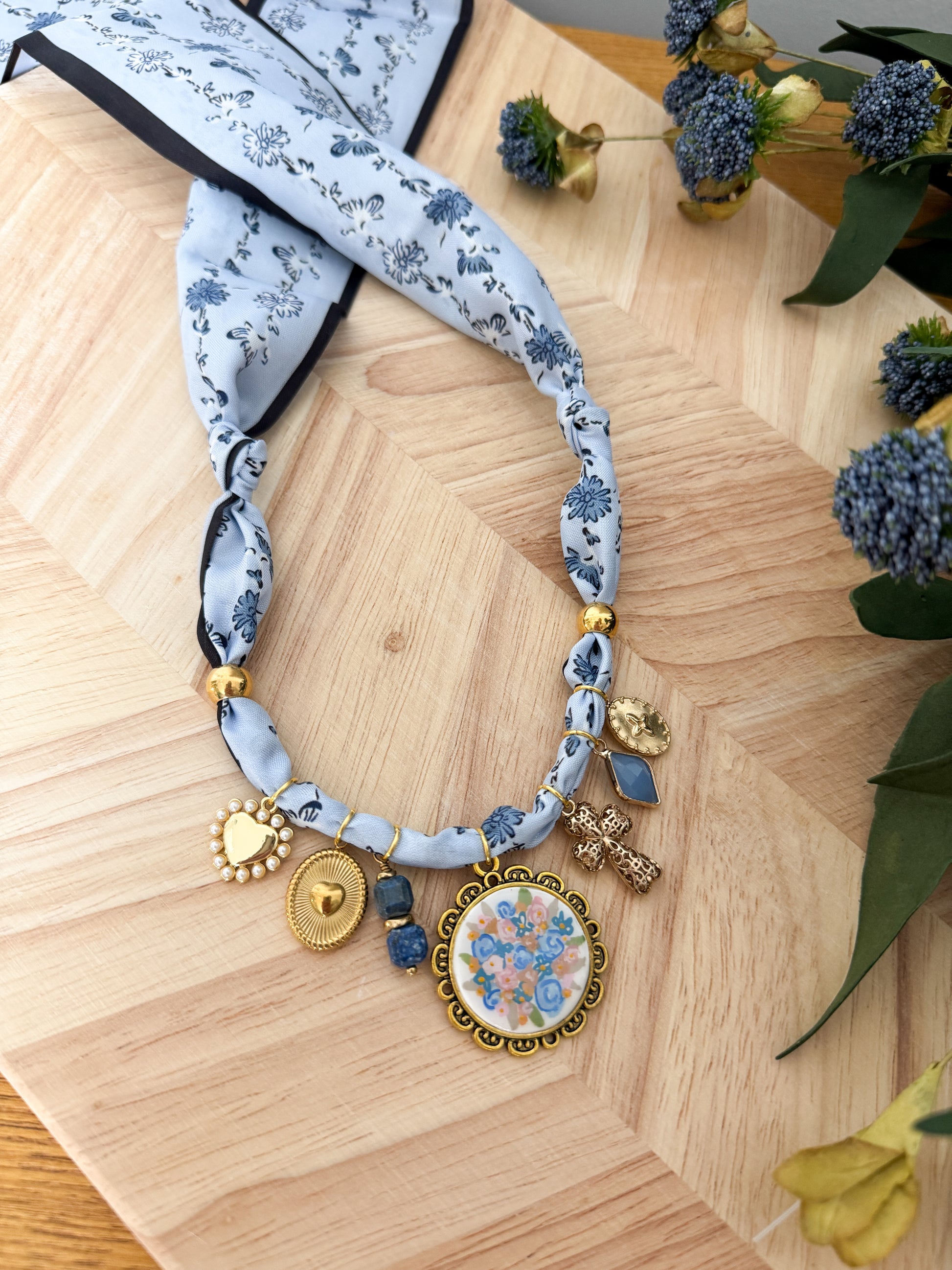 This handmade necklace is one of a kind with a variety of charms including hand-painted clay charms! This silk material necklace is adjustable by being able to tie it at whatever length you prefer.